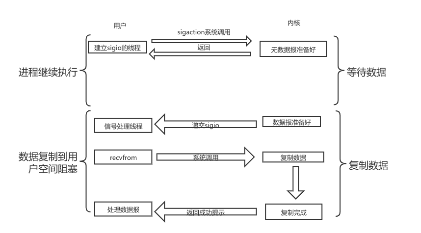 信号驱动 IO 模型在等待数据报期间是不会阻塞的,即用户进程(线程)发送一个 sigaction 系统调用后,此时立刻返回,并不会阻塞,然后用户进程(线程)继续执行(这一期间是不阻塞的);当数据报准备好时,此时内核就为该进程(线程)产生一个 SIGIO 信号,此时该进程(线程)就发生一次 recvfrom 系统调用将数据报从内核复制到用户空间,注意,这个阶段是阻塞的。
