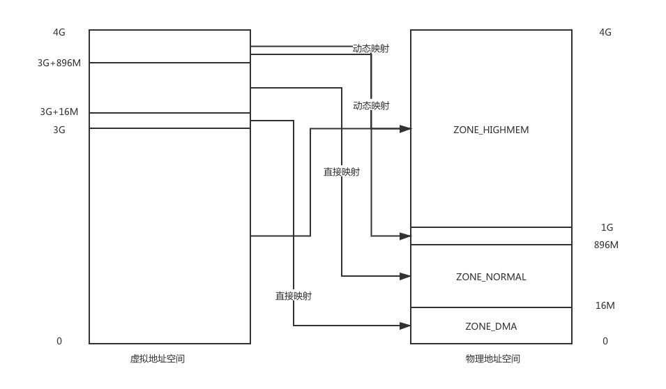 因为内核的虚拟地址空间只有1GB,但是需要访问整个4GB的物理空间,因此从物理地址0~896MB的部分,直接加上3GB的偏移,就得到了对应的虚拟地址,这种映射方式被称为线性/直接映射Direct Map。